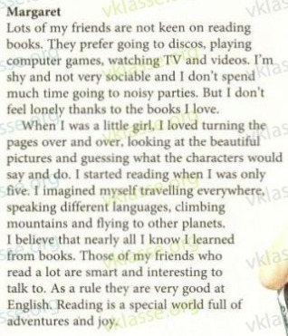 Lots of Margaret's friends are not keen on reading books. They prefer going to discos, playing computer games, watching TV and videos. She is shy and not very sociable and she doesn't spend much time going to noisy parties. But she doesn't feel lonely thanks to the books she loves.
