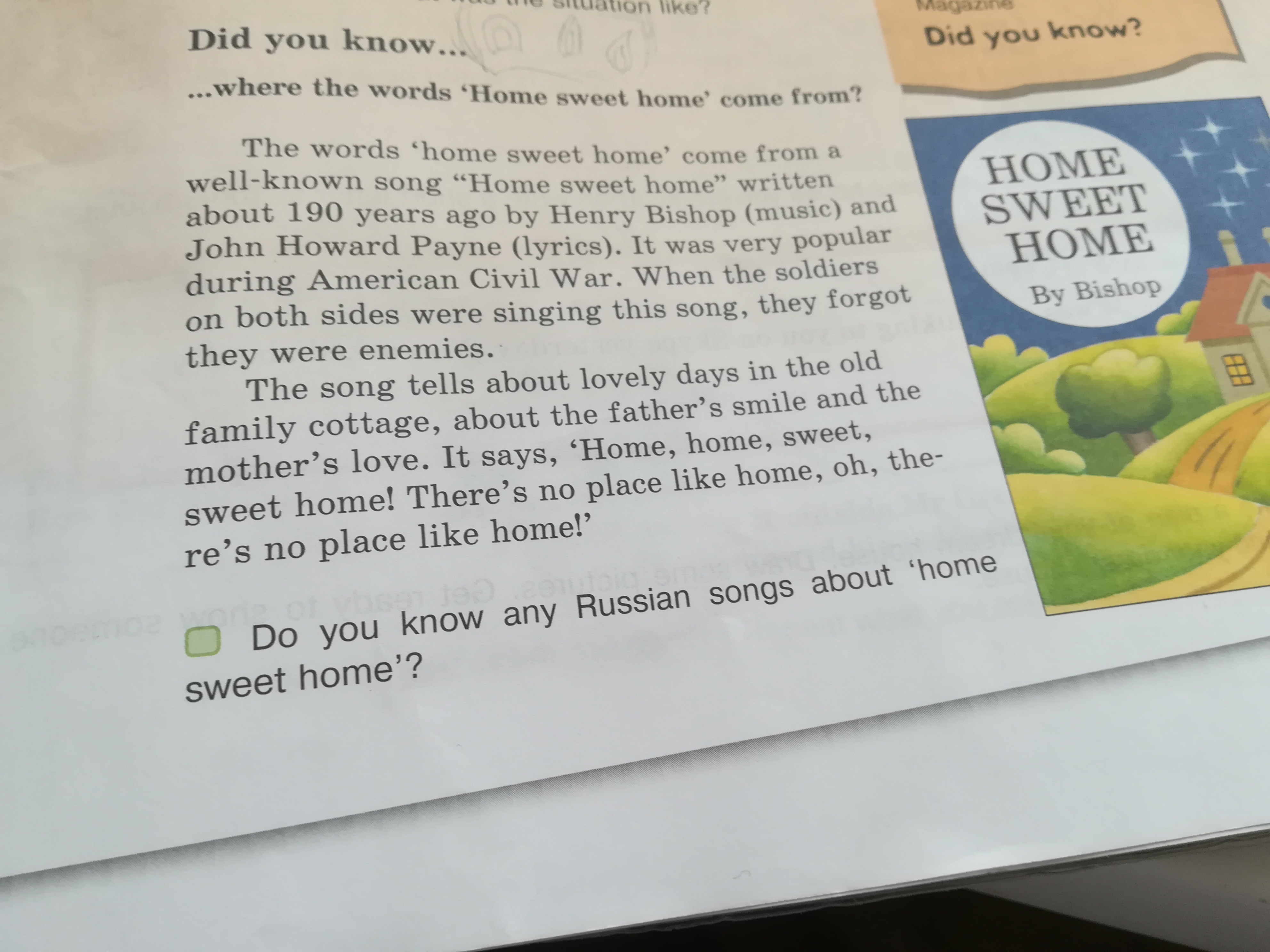 Слова "милый сердцу дом родной" взяты из хорошо известной песни, написанной 190 лет назад Генри Бишопом (музыка) и ДЖоном Говардом Пейне (слова)ю песня была очкеь популярна во вермя Американской Гражданской Войны. Когда солдаты по обе стороны пели эту пусню, они забывали о своей вражде.