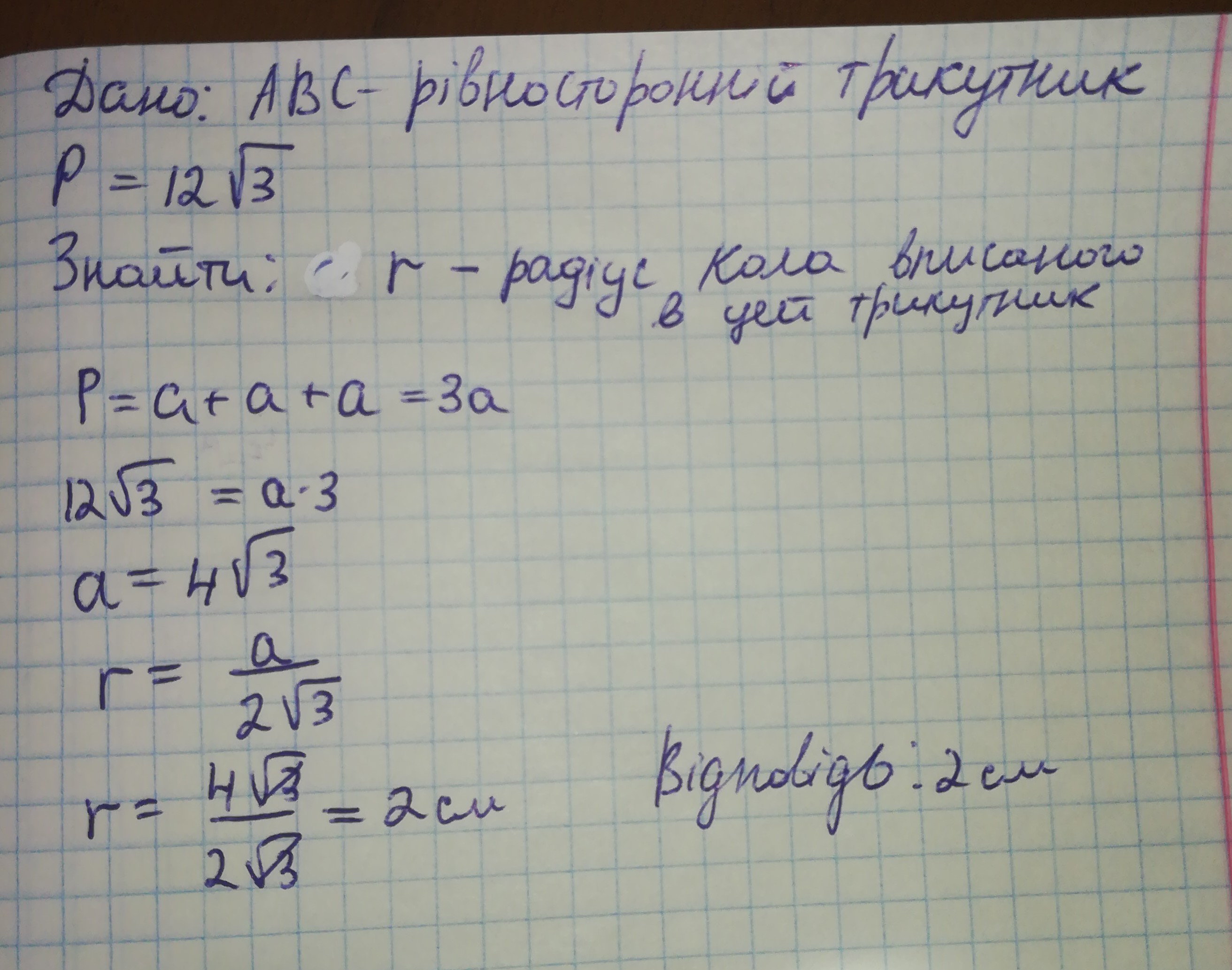 Периметр ривностороннього трикутника доривнюе 12√3 знайти радиус кола вписаного в цей трикутник.