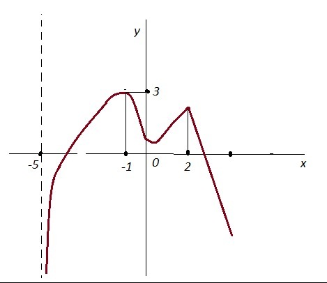 Начертите схематически график функции f(x), которая определена на промежутке (-5;4], непрерывна в точке x=2, но не дифференцируема в этой точке. Известно, что x= -1 - точка максимума, и f(-1)=3.