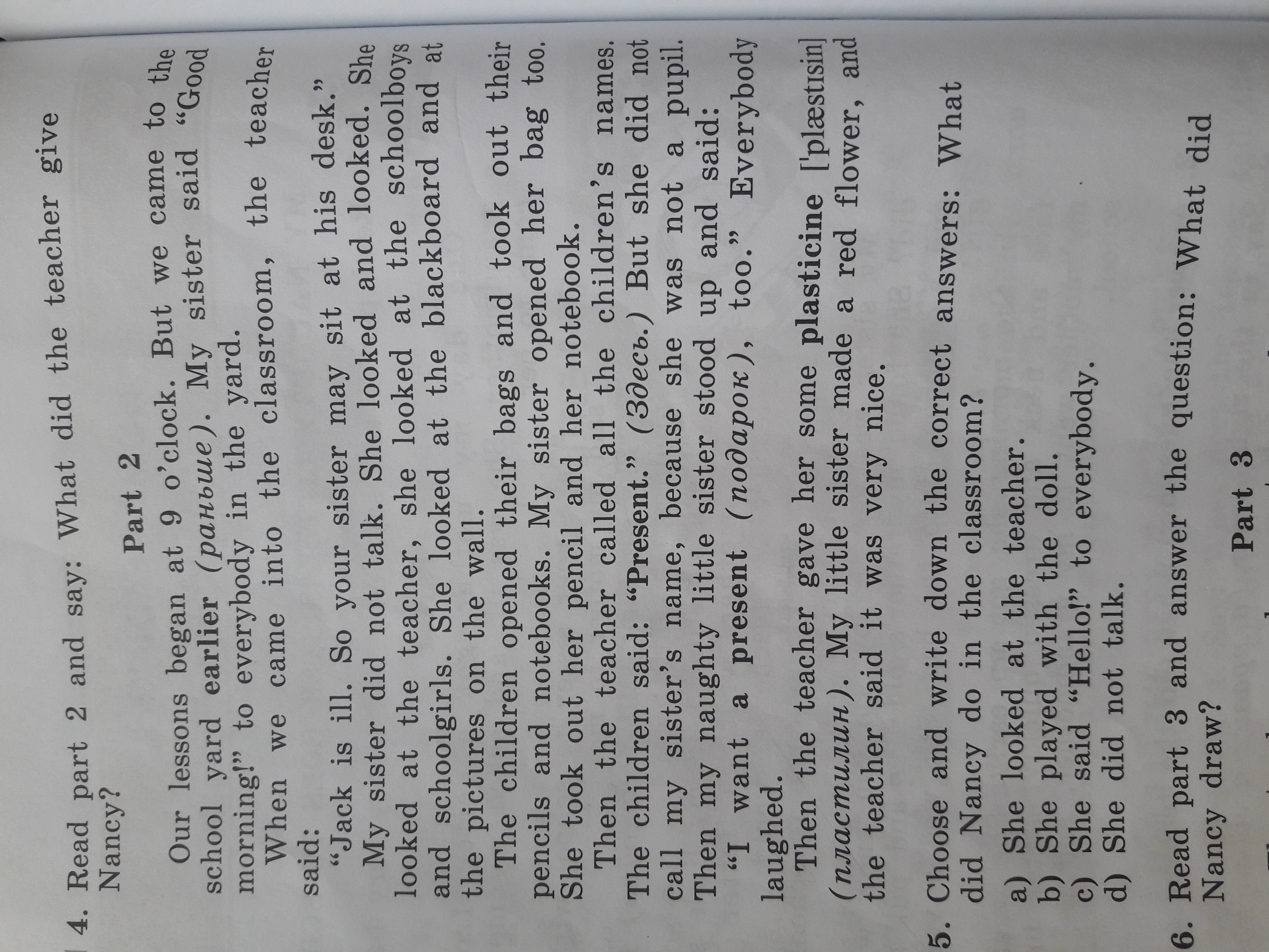 Часть 2 наших уроков началась в 9 часов. Но мы пришли «Ранняя школа Гор». Моя сестра сказала утром всем во дворе. Когда мы вошли в класс, учитель сказал: «Джек, я так, твоя сестра, может сидеть за своим столом. Она моя сестра не разговаривала. посмотрела на учителя, посмотрела на школьников и школьниц, Она посмотрела на фотографии и на фотографии. Дети открыли свои сумки, достали свои карандаши и записные книжки. Моя сестра тоже открыла сумку. ее карандаш и тетрадь, затем учитель назвал имена всех детей. Дети сказали: «Подарите» (30). Но она не назвала имя моей сестры, потому что она не была учеником. Тогда моя непослушная сестра встала и сказал: «Я хочу подарок (nooapox тоже)». Все засмеялись, учитель дал ей какой-то пластилин I'plaestrsinl (n.rac turut). Моя младшая сестра сделала красный цветок, и учитель сказал, что это очень приятно. и запишите правильные ответы: что сделала Нэнси в классе?) Она посмотрела на т eacher. б) Она играла с куклой. д) Она сказала: «Привет!» всем, г) Она не говорила.