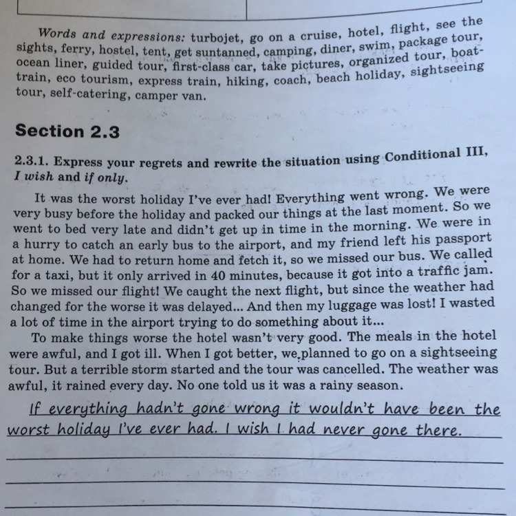 Раздел 2.3 2.8.1. Выражайте свои сожаления и перепишите ситуацию, используя Conditional I, я хочу и если только. Это было худшее, что я когда-либо слышал. Все пошло не так. Мы были заняты праздником и нашим последним моментом. Таким образом, мы упаковали вещи в постели очень поздно и не вставали вовремя утром. Мы спешили на раннем автобусе в аэропорт, а мой друг оставил свой паспорт дома. Мы должны были вернуться домой и забрать его, поэтому мы пропустили наш автобус. Мы позвонили на такси, но он прибыл только через 40 минут, потому что он попал в пробку. Поэтому мы пропустили наш полет! Мы поймали следующий бой, но так как погода изменилась к худшему, это было отложено ... И тогда мой багаж был потерян! Я потратил много времени в аэропорту, пытаясь что-то сделать ... Чтобы все ухудшилось, отель оказался не очень хорошим. Еда в отеле была ужасной, и я заболел. Когда я поправляюсь, мы, планировали отправиться на обзорную экскурсию. Но начался страшный шторм, и тур был отменен. Погода была ужасная, дождь шел каждый день. Никто не сказал, что сезон дождей. Если бы все не пошло не так, это был бы не худший праздник, который у меня когда-либо был. желание никогда не было туда