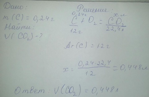 Определите объём оксида углерода 4 который образуется при зжигании 0,24г углерода. С дано и решением . Заранее спасибо)