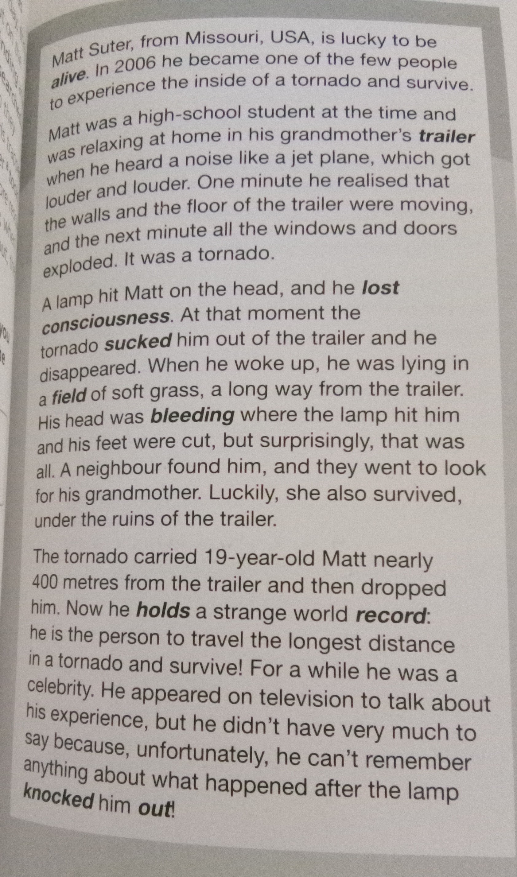 Мэтт Сатер из Миссури, США повезло остаться в живых. В 2006 году он стал одним из немногих людей которые оказались внутри смерча и выжили. Мэтт был учеником средней школы и в то время он отдыхал дома у бабушкином трейлере. Когда он услышал шум похожий на реактивный самолёт, который был всё громче и громче. Через минуту он понял, что стены и пол трейлера двигались, а в следующую минуту все окна и двери взорвались. Это был торнадо. Лампа попала Мэтту в голову, и он потерял сознание. В ЭТОТ МОМЕНТ торнадо высосал его из трейлера и он пропал. Когда он проснулся он лежал в поле на мягкой траве, далеко от трейлера. Его голова истекла кровью, ноги были порезаны,все соседи искали его и его бабушку. К счастью она выжила. Торнадо унёс 19 летнего Мэтта почти в 400 метрах от трейлера, а затем он упал. Сейчас он держит странный мировой рекорд, чтобы пройти самое длинное расстояние в торнадо и выжить. На некоторое время он был знаменитостью, он появился на телевидении, чтобы поговорить о его опыте, но он ничего не может вспомнить, что произошло после лампы ударившей его.