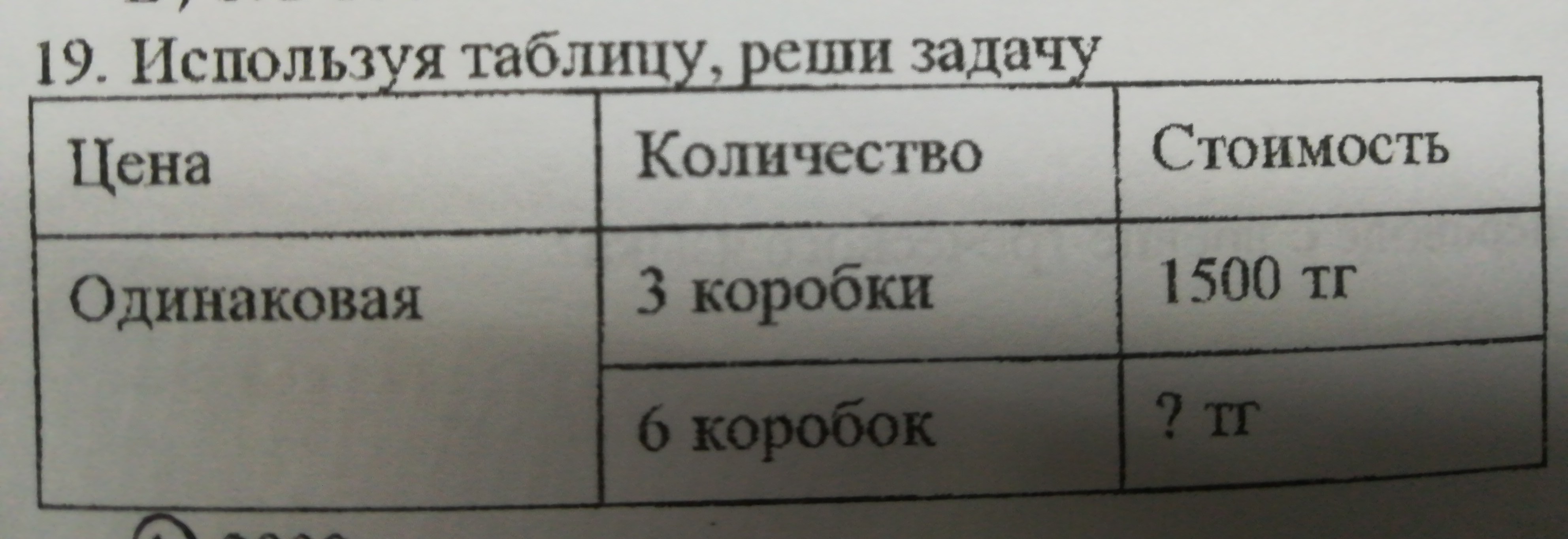 используя таблицу Реши задачу цена количество стоимость одинаковые коробки 6 коробок 3 коробок 1500 тенге 6 коробок неизвестный тенге