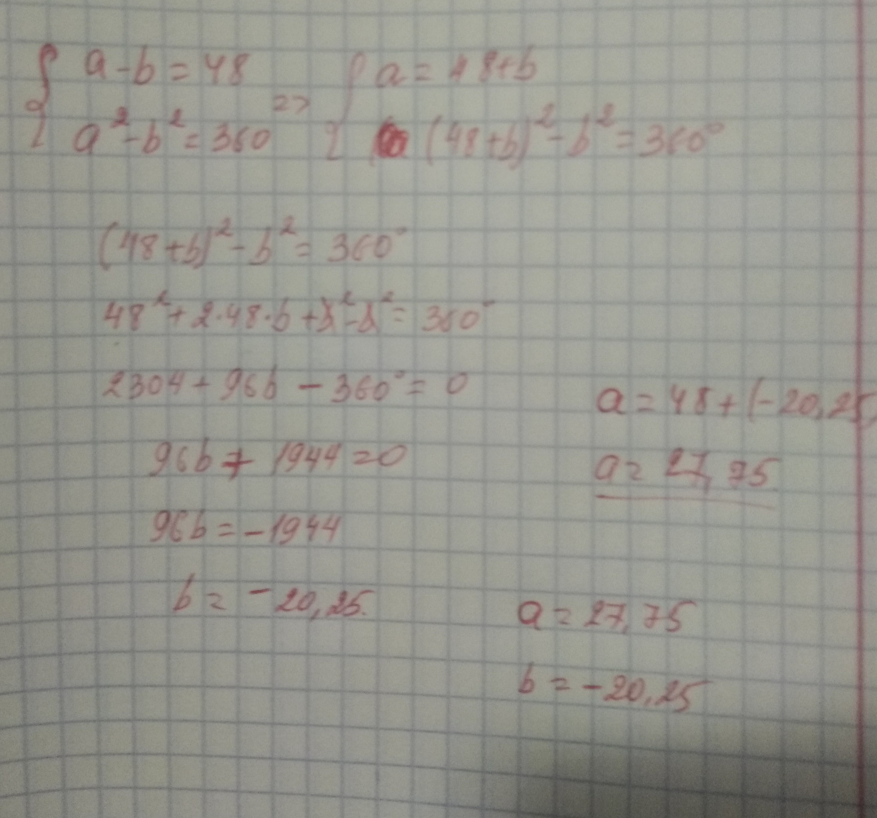 х^2-y^2=360 (48+y)^2-y^2=360 y=-20.25 y=-20.25