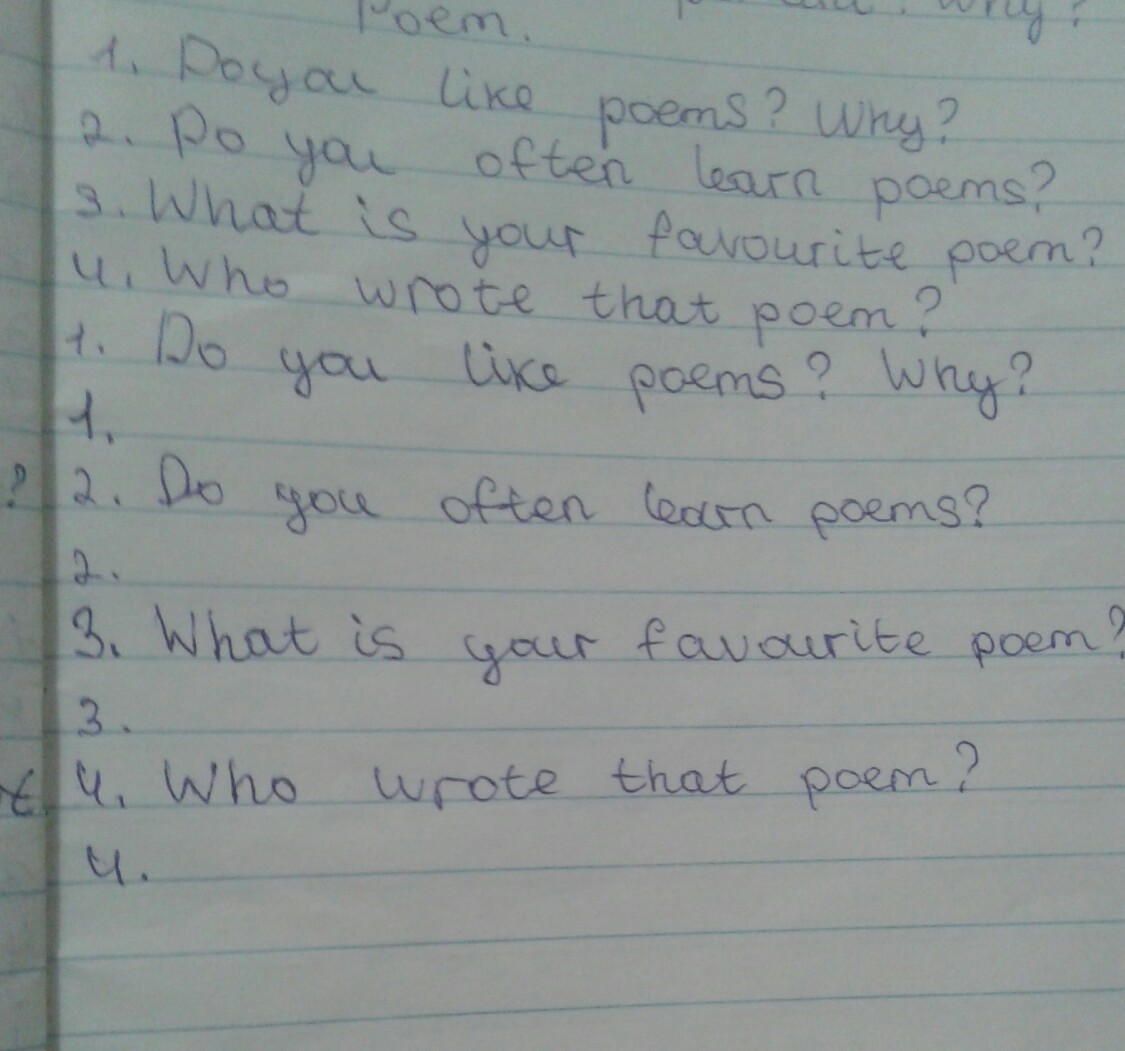 1. Любишь стихи? Почему? 2. Часто ли учишь стихи? 3. Какой твой любимый стих? 4. Кто написал твой любимый стих (автор)?