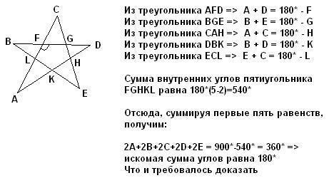 не любого многогранника. там продолжи линиями через звезду и получиш треугольники потом записывай суммы углов и выражай главный угол который нужен и умножай на 5