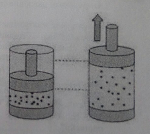 До поднятия сосуда молекулы газа чаще бьются о стенку, чем после поднятия поршня, так как одинаковое кол-во газа находится в сосуде, в котором меньше объем, там такоеже кол-во в большем объеме следавательно давление на левой картинке больше чем в правой