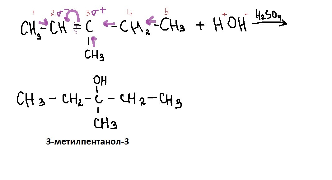 3) Фиолетовым - передача электронной плотности от радикала к радикалу. Так как справа радикалов больше, значит двойная связь рвется + эл. плотность переходит к правой части). Н воды присоединяется к -, ОН к +.