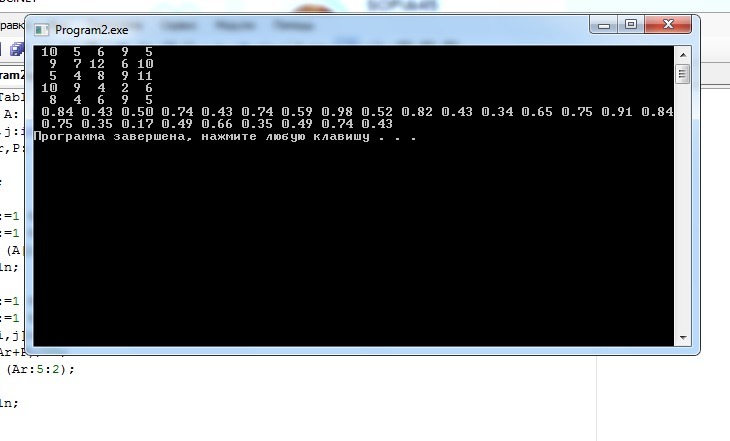 Type Tabl = array [1..5,1..5] of integer;const A: Tabl = ((10,5,6,9,5) , (9,7,12,6,10), (5,4,8,9,11), (10,9,4,2,6), (8,4,6,9,5));var i,j:integer;var Ar,P: real;beginAr:=1;P:=0;for i:=1 to 5 do beginfor j:=1 to 5 dowrite (A[i,j]:3);writeln;end;for i:=1 to 5 dofor j:=1 to 5 do beginP:=A[i,j]+A[i,j];Ar:=(Ar+P)/25;write (Ar:5:2);end;writeln;end.