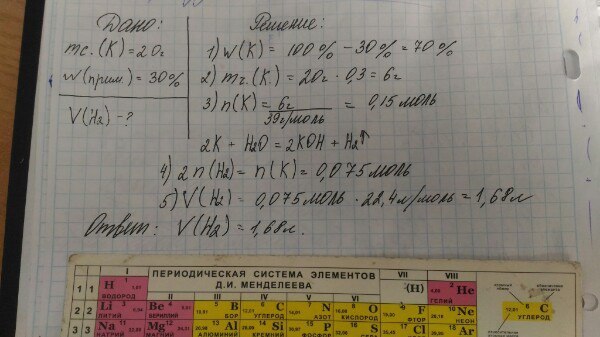 вычислите объем водорода который образуется при взаимодействии с водой 20 г калия содерж 30% примесей