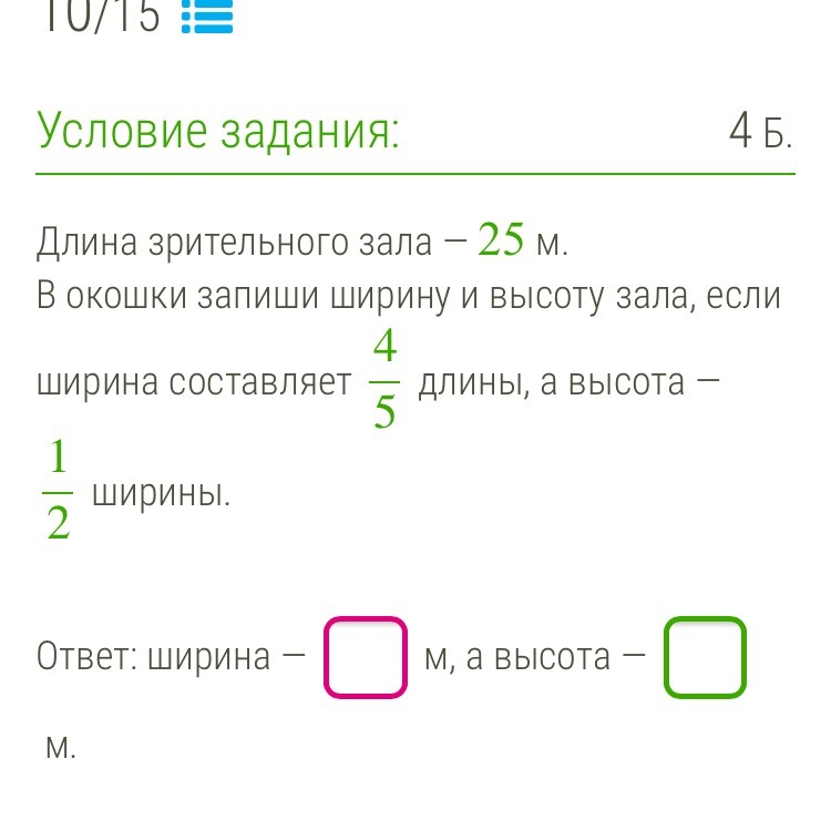 Смотри, ширина = 4/5 длины, это мы находим так 25 делим на 5 частей и логично, что получаем 5, значит 4 части из этих пяти = четырём пятёркам, а значит 20.