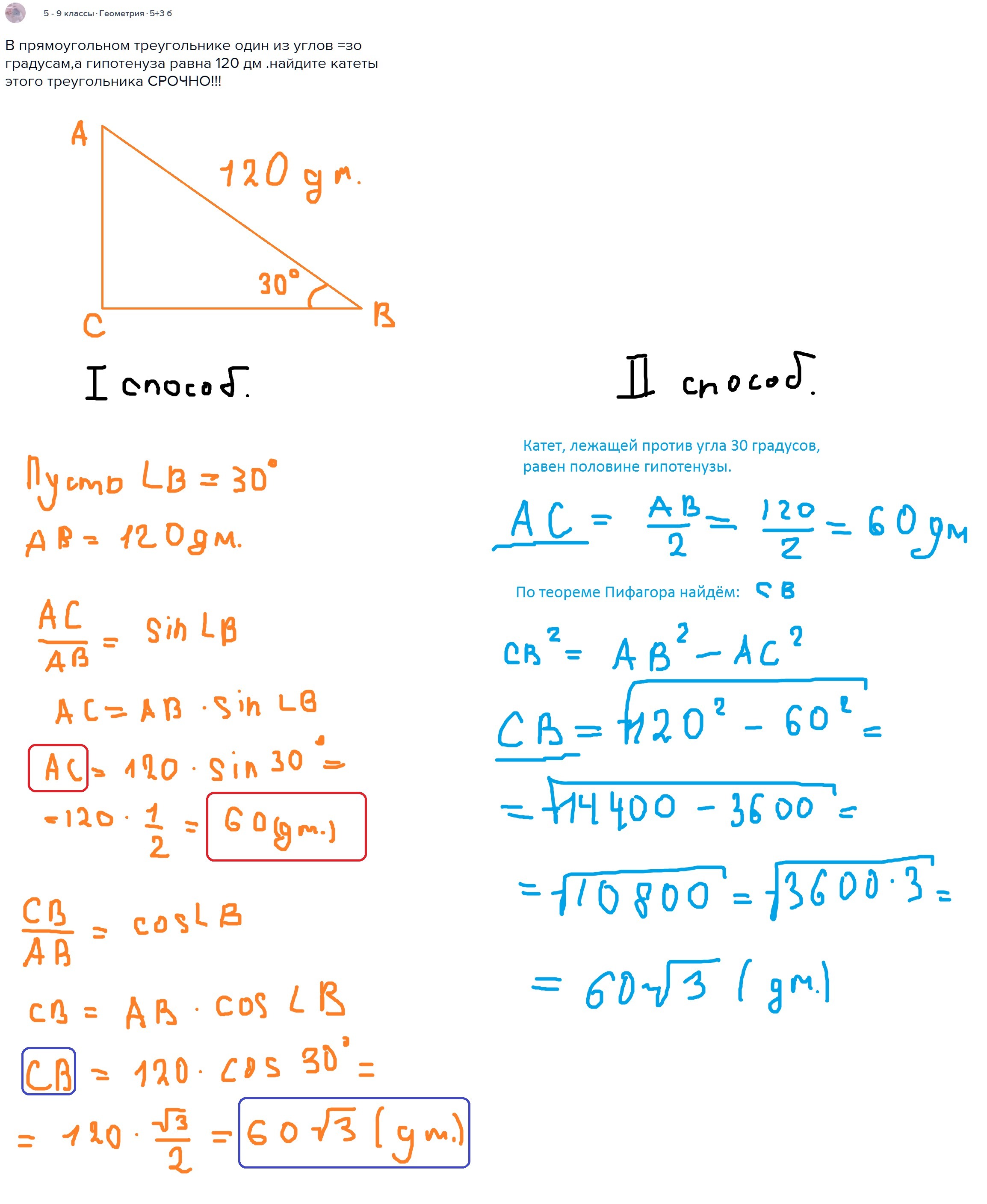 в прямоугольном треугольнике один из углов =зо градусам,а гипотенуза равна 120 дм .найдите катеты этого треугольника СРОЧНО!!!