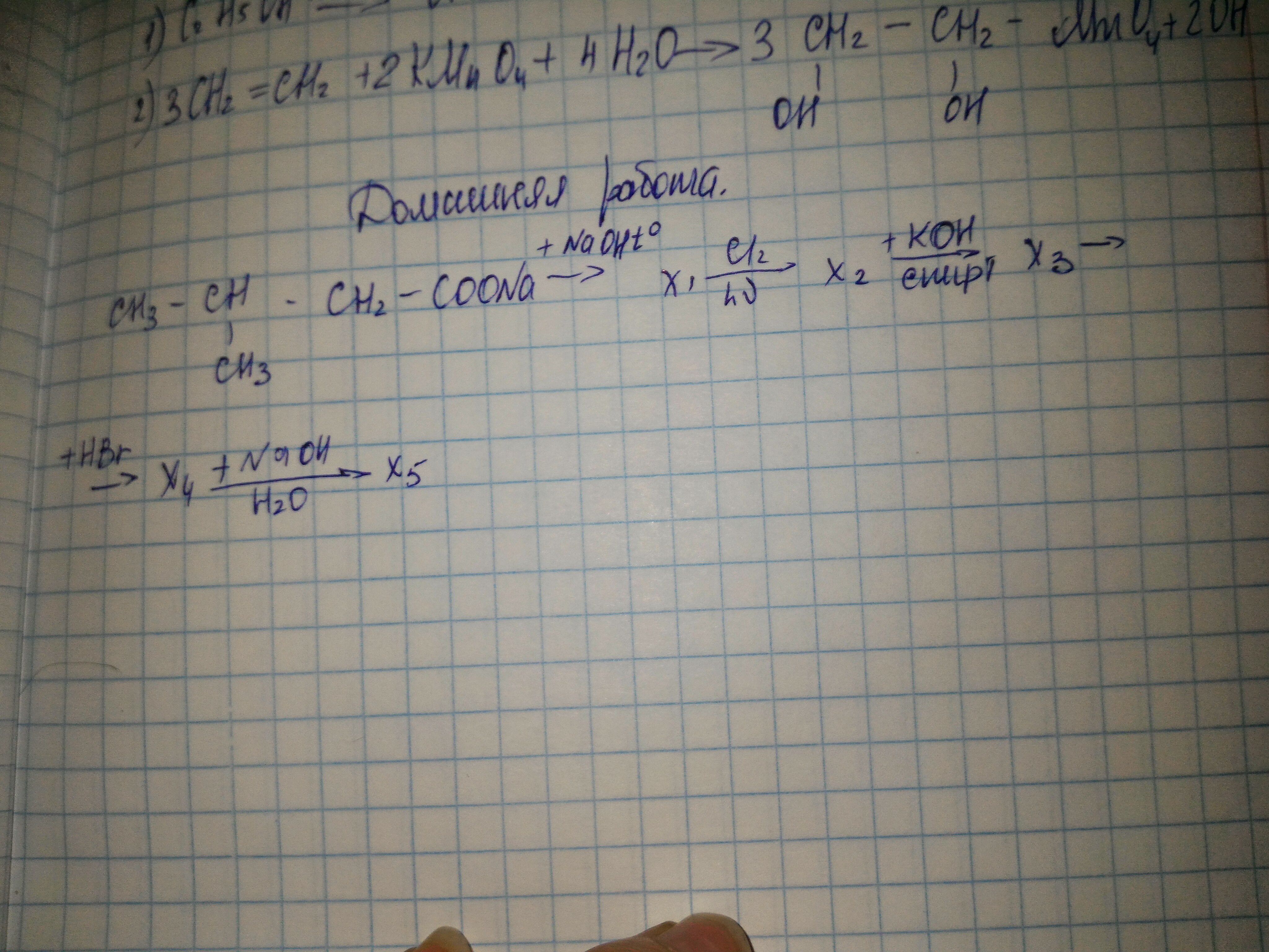 (СН3)2С=СН2 + HBr= (CH3)2CBr-CH3 (Х4)- присоединение HBr по Марковникову (водород - к более гидрированному атому углерода)