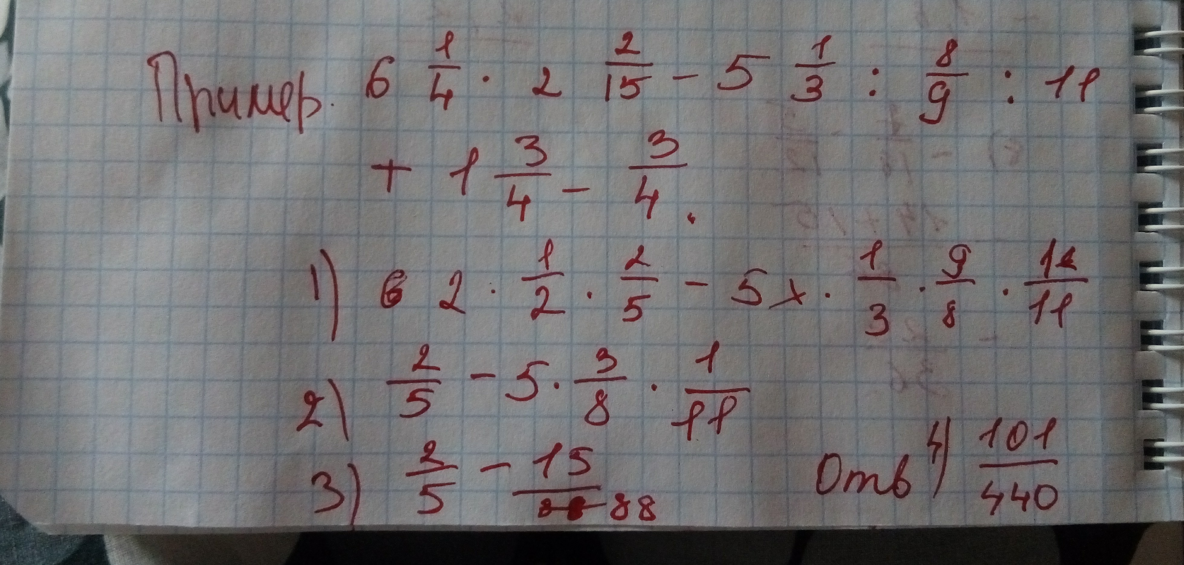 пожалуйста 6 целых 1/4 х 2 целых 2/15 - 5 целых 1/3 поделить на 8/9 поделить на 11 плюс 1 целых 3/4 - 3/4 правильный ответ 2 целых 2/3 знаю только ответ