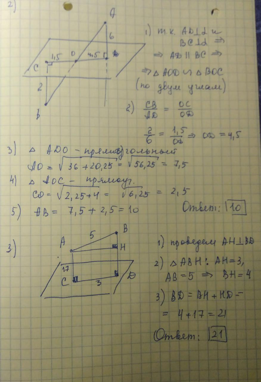 2. Отрезок AВ пересекает некоторую плоскость в точке О. Прямые АД и ВС, перпендикулярные этой плоскости, пересекают ее в точках Д и С соответственно, АД = 6 см. ВС = 2 см. ОС = 1.5 см. Найдите АВ.