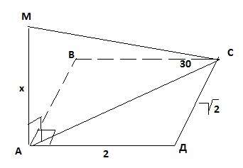 6. Отрезок АМ является перпендикуляром к плоскости прямоугольника АВСД. Угол между прямой МС и этой плоскостью равен 30°, АД = √(2), СД = 2. Найдите АМ.