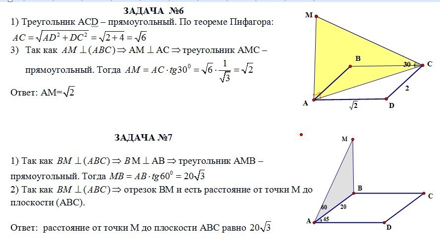 7. В параллелограмме АВСД АВ = 20 см, ВАД = 45°, ВМ - перпендикуляр к плоскости АВС. Угол между прямой МА и плоскостью АВС равен 60°. Найдите расстояние от точки М до плоскости АВС.