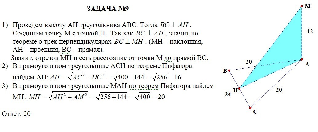 9. В треугольнике АВС известно, что АВ = АС = 20 см, ВС = 24 см. Отрезок МА перпендикулярен плоскости AВС и имеет длину 12 см. Найти расстояние от точки М до прямой ВС.
