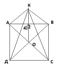 19. Диагонали квадрата АВСД пересекаются в точке О. КО - перпендикуляр к плоскости квадрата. КО=4√(2) см. Докажи гс равенство углов, образуемых прямыми КА, КВ, КС и КД с плоскостью квадрата. Найдите эти углы, если периметр АВСД равен 32 см.