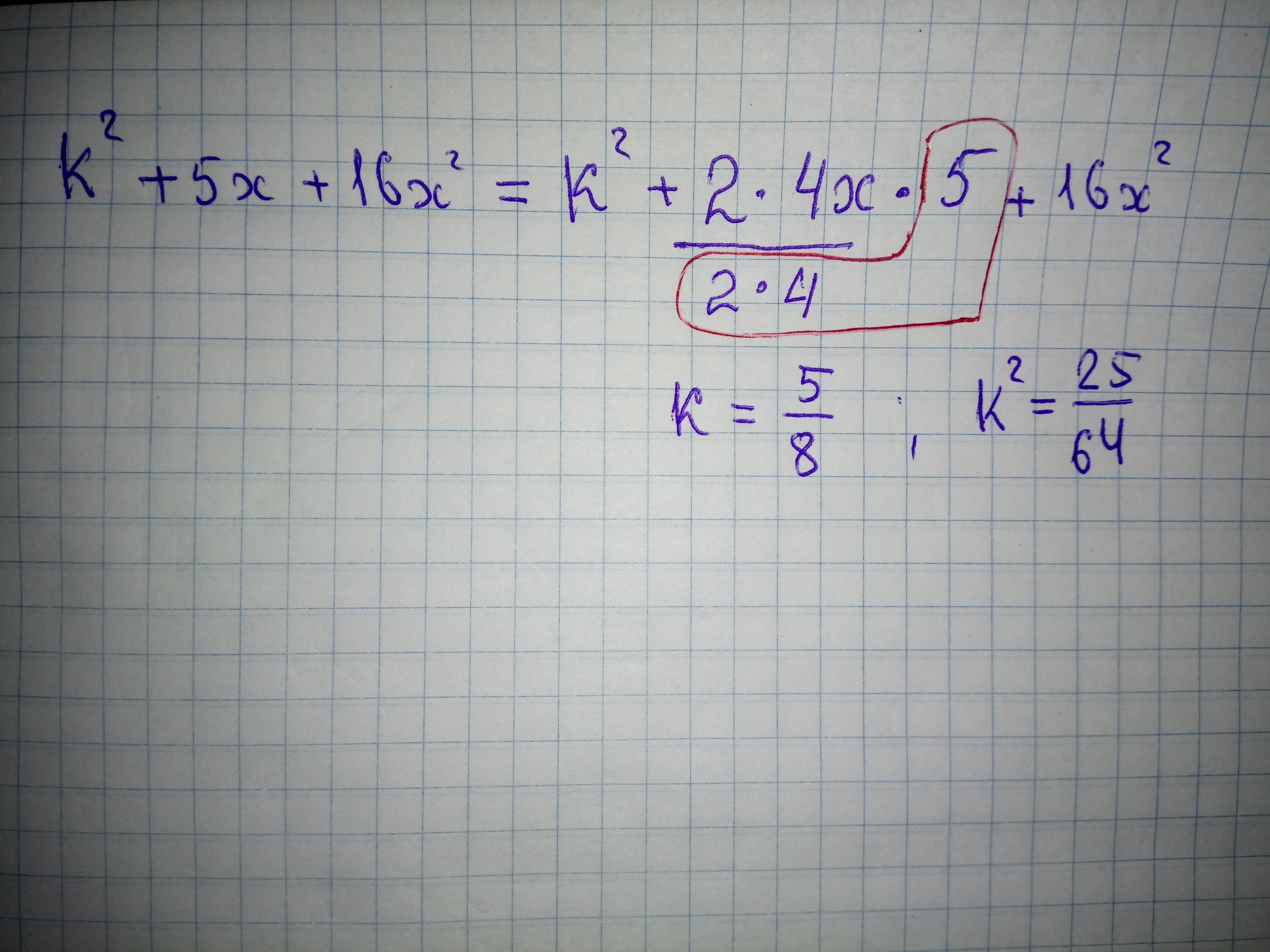 k²+5x+16x² = (4x)² +2*4x*(5/8) + (5/8)² + k² -(5/8)² = (4x +5/8)² + k² - (5/8)² .