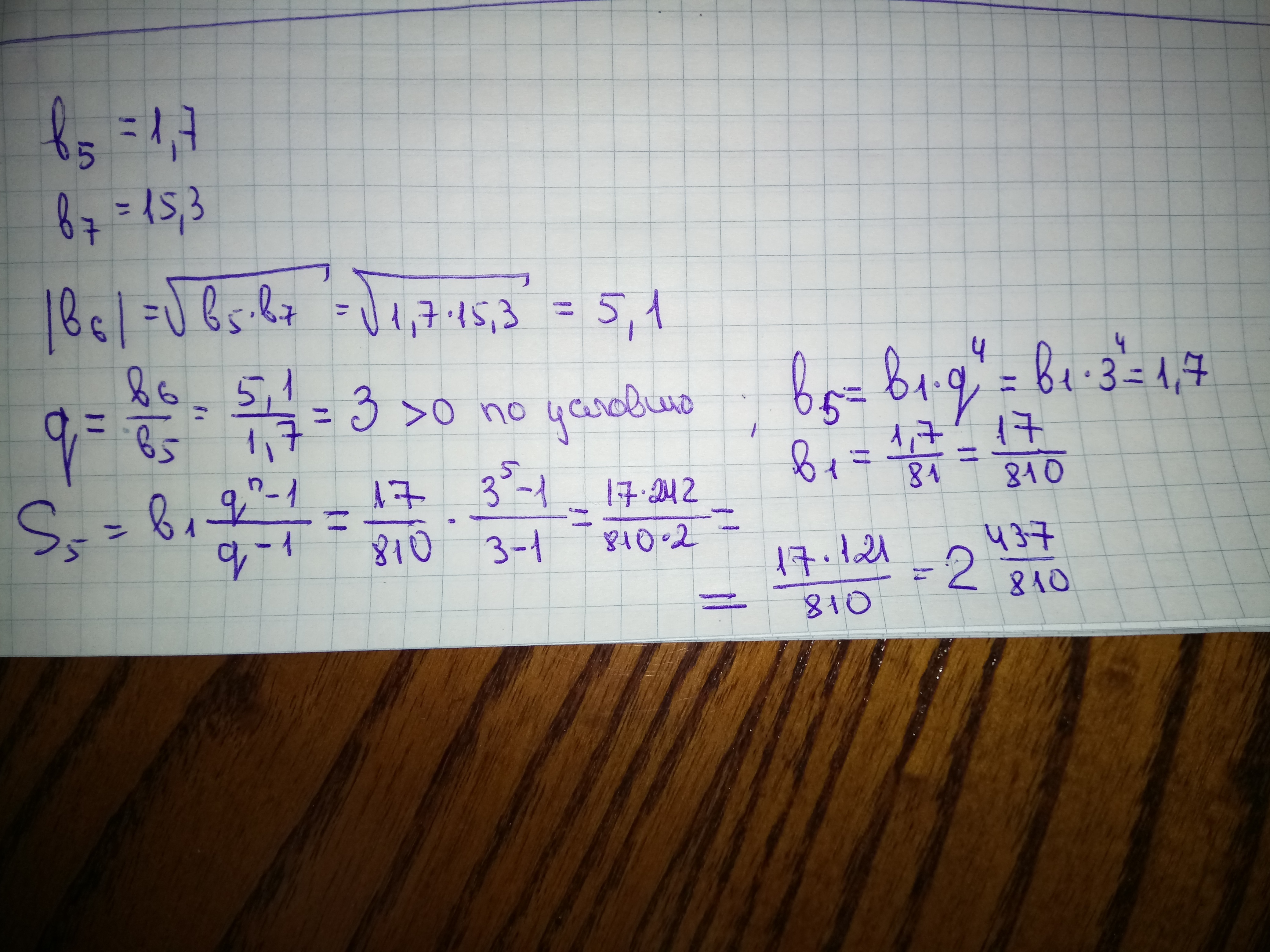 найдите сумму пяти членов геометрической прогрессии с положительными членами зная что b5=1,7 и b7=15,3