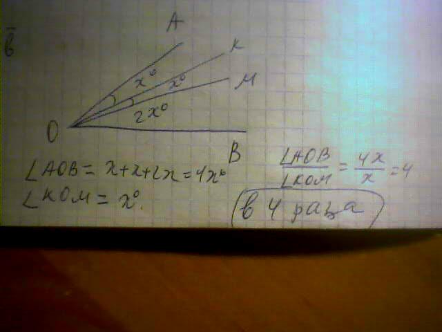 OM-луч,делящий угол AOB пополам,OK-луч,делящий угол AOM пополам.Во сколько раз угол KOM меньше угла AOB?Обоснуйте ответ.Заранее спасибо:)