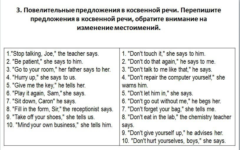 The teacher told Joe to stop talking. She told him to be patient. Her father told her to go to her room. She told us to hurry up. He told her to give him the key. She told Sam to play it again. He told Caron to sit down. The receptionist told him to fill in the form. She told us to take off our shoes. She told him to mind his own business.