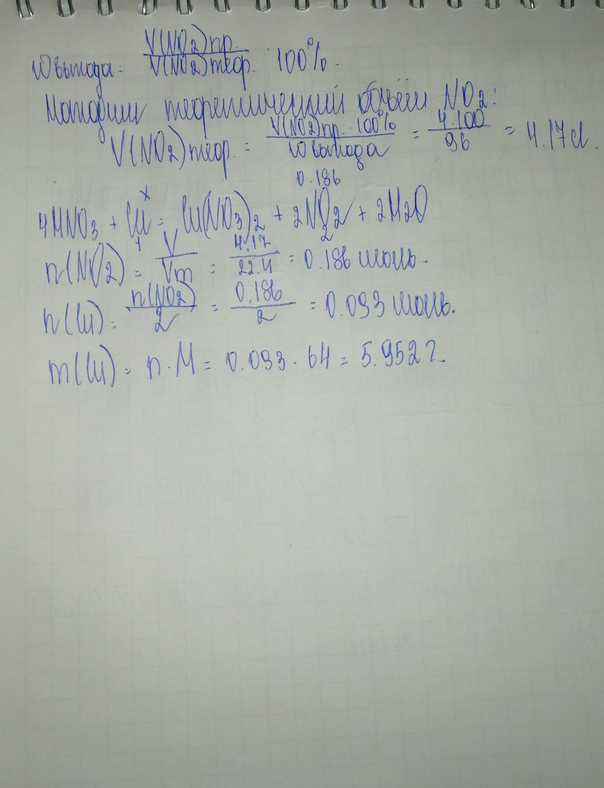 VПрактический NO2=4 литра .Массовая доля выхода NO2=96 процентов m(cu) неизвестно.