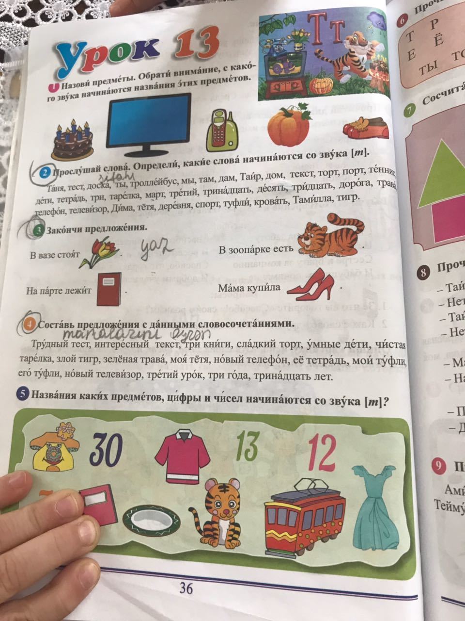 На уроке был трудный тест. Интересный текст хочется читать. Три книги лежат на полке. На праздник купили сладкий торт. В школе учатся умные дети. На столе стоит чистая тарелка. В зоопарке находится злой тигр. За окном появилась зелёная трава. В гости к нам пришла моя тётя. Мне купили новый телефон. Её тетрадь лежала на парте. Мои туфли самые красивые. Его туфли стояли в коридоре. Новый телевизор лучше старого. В школе идёт третий урок. Три года девочка занимается танцами. Тринадцать лет назад построили дом.
