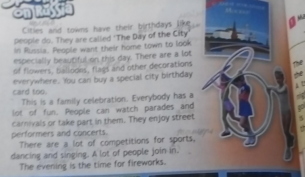 Города и города имеют свои дни рождения, как люди. Они назвали «День Города», чтобы посмотреть в Россию. Люди хотят, чтобы в этот день их родной город был очень болором. Всюду в мире есть цветы, воздушные шары, флаги и другие украшения. Вы также можете купить специальную карточку рождения города, Это семейный праздник: всем очень весело, люди могут наблюдать за парадами и карнавалами или участвовать в них, им нравятся уличные артисты и канцеры, а также множество конкурсов для спортивных танцев и пения. Вечер - это время фейерверков.