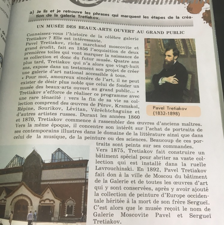П0:32 53 а) Я читаю, и я нахожу предложения, которые отмечают стадии создания МУЗЕЯ BEAUx-ART, ОТКРЫВАЕМЫЕ ОБЩЕСТВЕННОМУ ОБЩЕСТВЕННОМУ. Знаете ли вы историю Третьякова - знаменитая галерея великого Третьякова. богатый московский купец и ученый, сделанный в приобретении двух звезд, который будет отмечать деление и, следовательно, более позднего. который, в то время как галерея в проекте завещания для создания национального искусства, доступного для всех для меня, искреннего любителя искусства, может существовать более благородное желание, чем создание музея изобразительного искусства, открытого для великой публики Третьякова стремится к достижению этой программы с редким упорством к концу своей жизни. В его сборник вошли произведения Перова, Павла Третьякова из других русских художников. Во время и (1832-1898) 1860-х и 1870-х годов Третьяков начал собирать работы бывших мастеров. Примерно в то же время он сосредоточил свой интерес на покупке портретов знаменитых современников в области литературы, а также в музыке, живописи или науке. Многие из этих портретов покрашены по его приказу. Около 1875 года Третьяков построил специальное здание для размещения своего обширного уклона, расположенного в Лаврушинском переулке. В 1892 году Павел Третьяков пожертвовал городу Москве здание Галереи и все сохранившиеся произведения искусства, добавив коллекцию западноевропейской живописи, унаследованной от смерти его брата Сергей. Именно тогда музей получил имя Московитская галерея Павел и Сергей Третьяков КАЗАКОВАКАТ 2004.