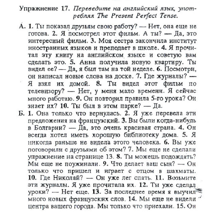 9. What is your son doing? — He has just come and is playing chess with his father. 10. Where is Nickolay? — He has already gone to bed.