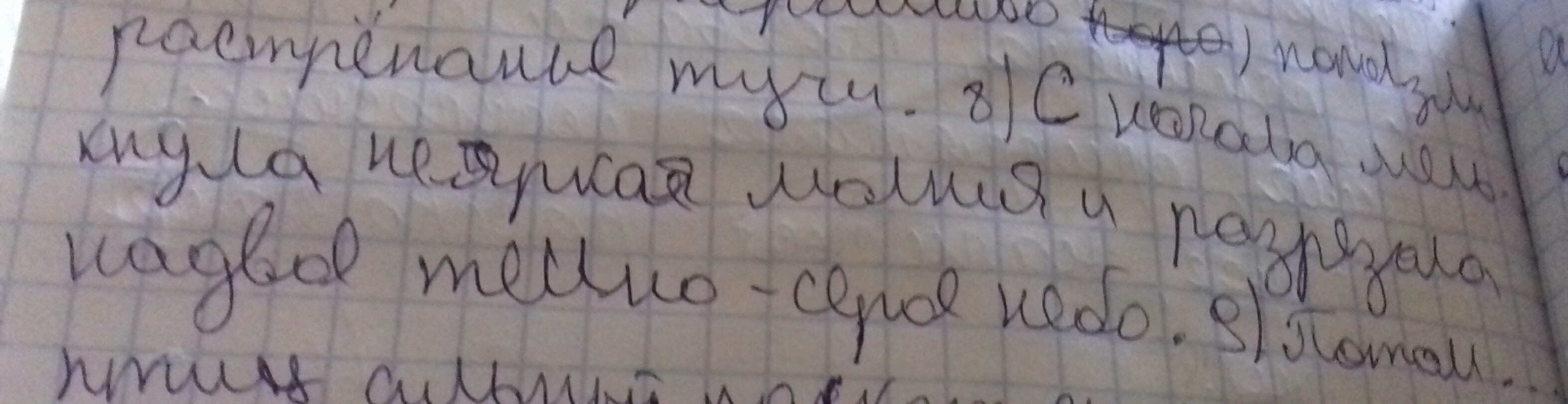 Сначала - наречие, мелькнула - глагол, неяркая - прилагательное, молния - существительное, и - союз, разрезала - глагол, надвое - наречие, темно-серое - прилагательное, небо - дополнение