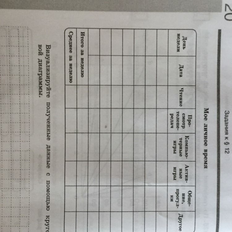 Помогите пожалуйста ) В течение недели фиксируйте в таблицы то как вы распоряжаетесь своими свободными времени нами сколько времени посещаете чтению книг сколько просмотров телепередачи сколько общение с друзьям и так далее