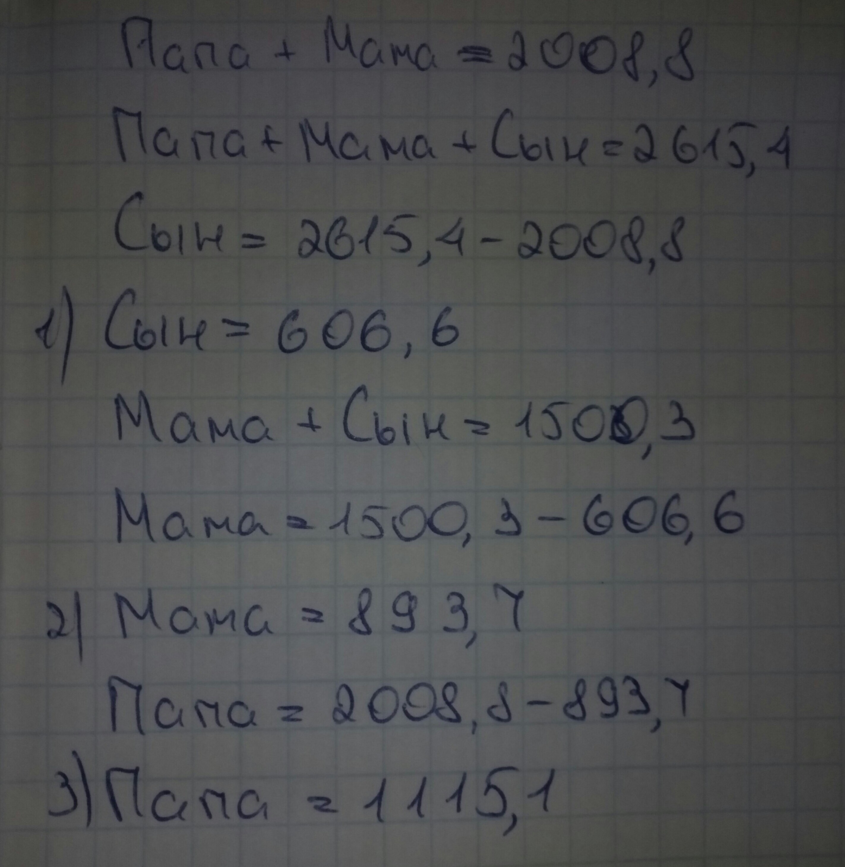 папа мама и их сын. Положили на счёта в банке 2615,4евро.Сумма вкладов папы и мамы составляет 2008,8евро ,а мамы и сына -1500,3 евро .Сколько денег на счёту у каждого члена семьи? Зарание спасибо