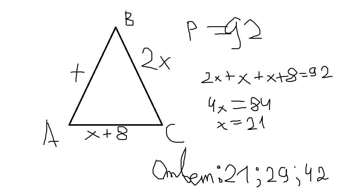 периметр треугольника ABC равен 92 см длина стороны AB вдвое меньше длины стороны BC и на 8 см меньше длины стороны AC Какова длина каждой стороны треугольника