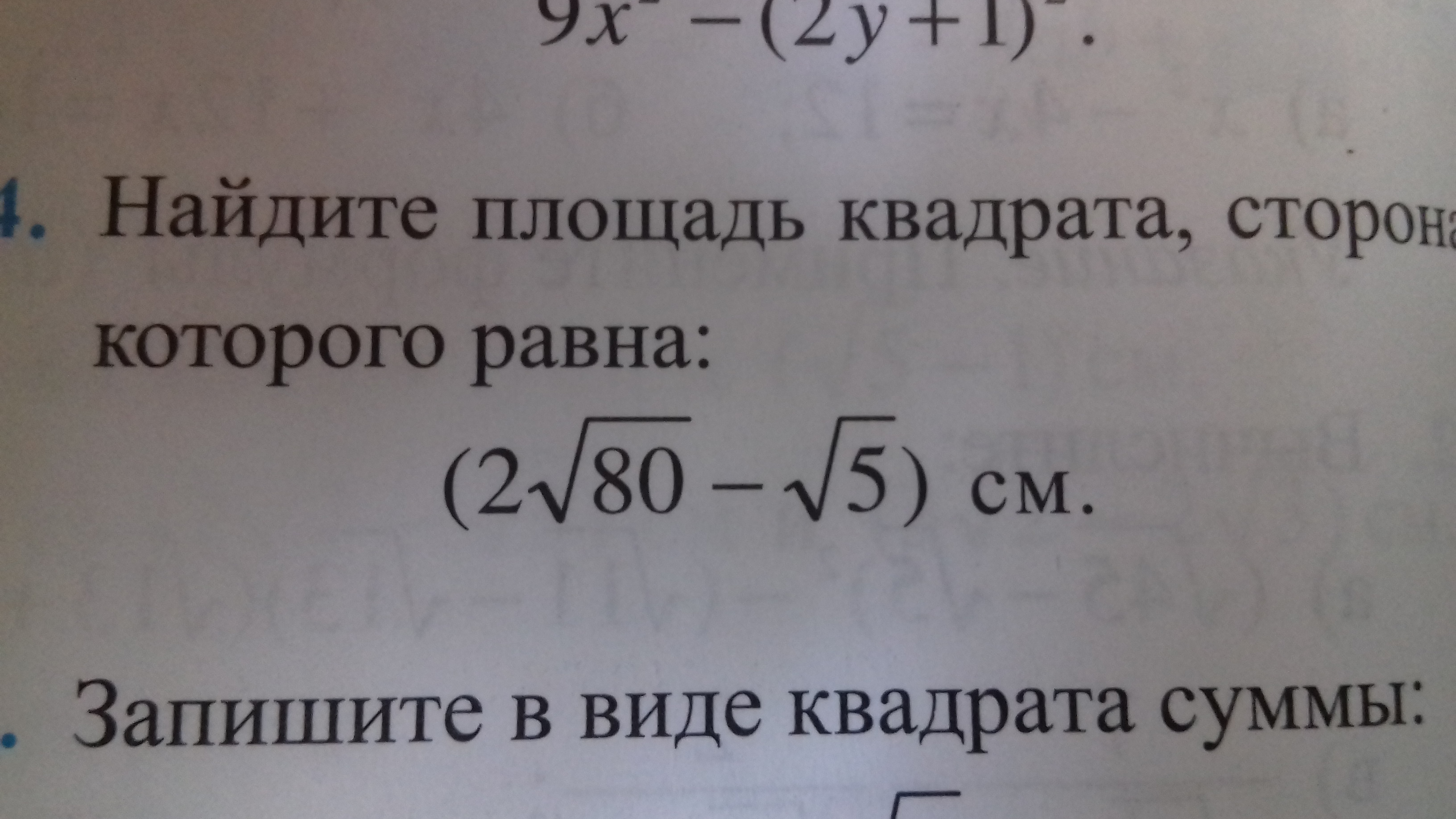 S=a^2=(2 sqrt{80}- sqrt{5})^2=(2 sqrt{16*5}- sqrt{5})^2=(2*4 sqrt{5}- sqrt{5})^2=\\=(8 sqrt{5}-  sqrt{5})^2=(7 sqrt{5})^2=49*5=245