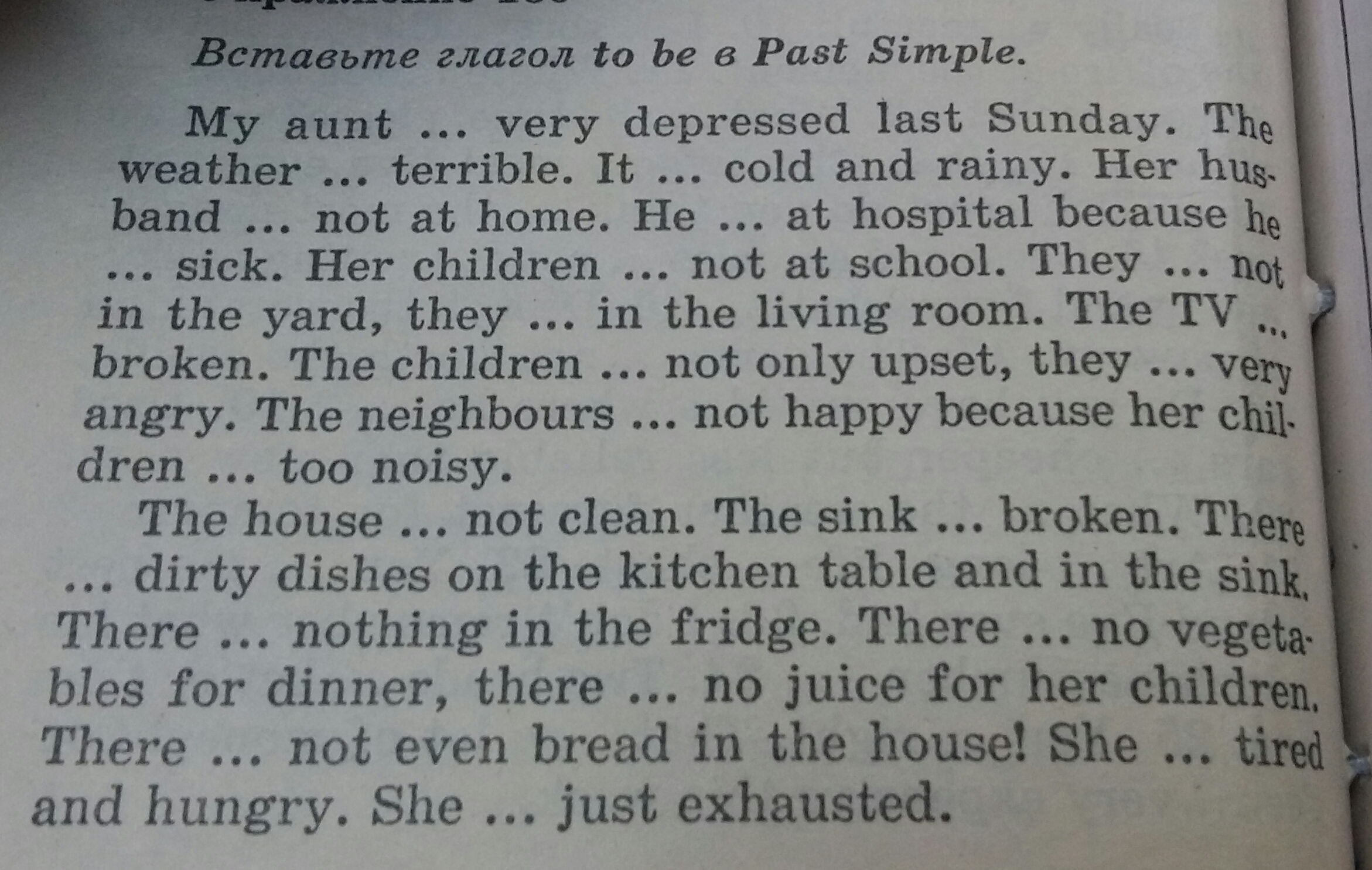 My aunt was very depressed last Sunday. The weath¬er was terrible. It was cold and rainy. Her husband was not at home. He was at hospital because he was sick. Her children were not at school. They were not in the yard, they were in the living room. The TV was broken. The children were not only upset, they were very angry. The neighbours were not happy because her children were too noisy. The house was not clean. The sink was broken. There were dirty dishes on the kitchen table and in the sink. There was nothing in the fridge. There were no vege¬tables for dinner, there was no juice for her children. There was not even bread in the house! She was tired and hungry, She was just exhausted.