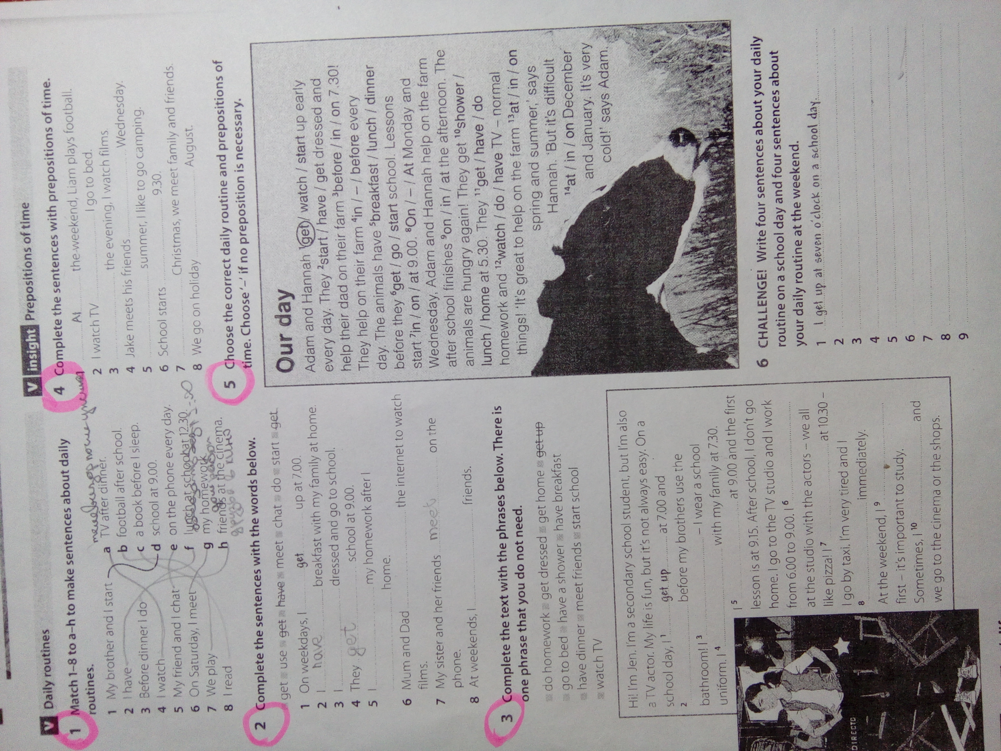 3) 1 get up 2 have a shover 3 get drassed 4 have brakfast 5 start school