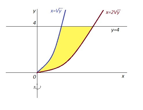 Найти обьём тела, полученного вращением вокруг оси Oy фигуры, ограниченной линиями x=y^(1/2); x=2*y^(1/2); y=4