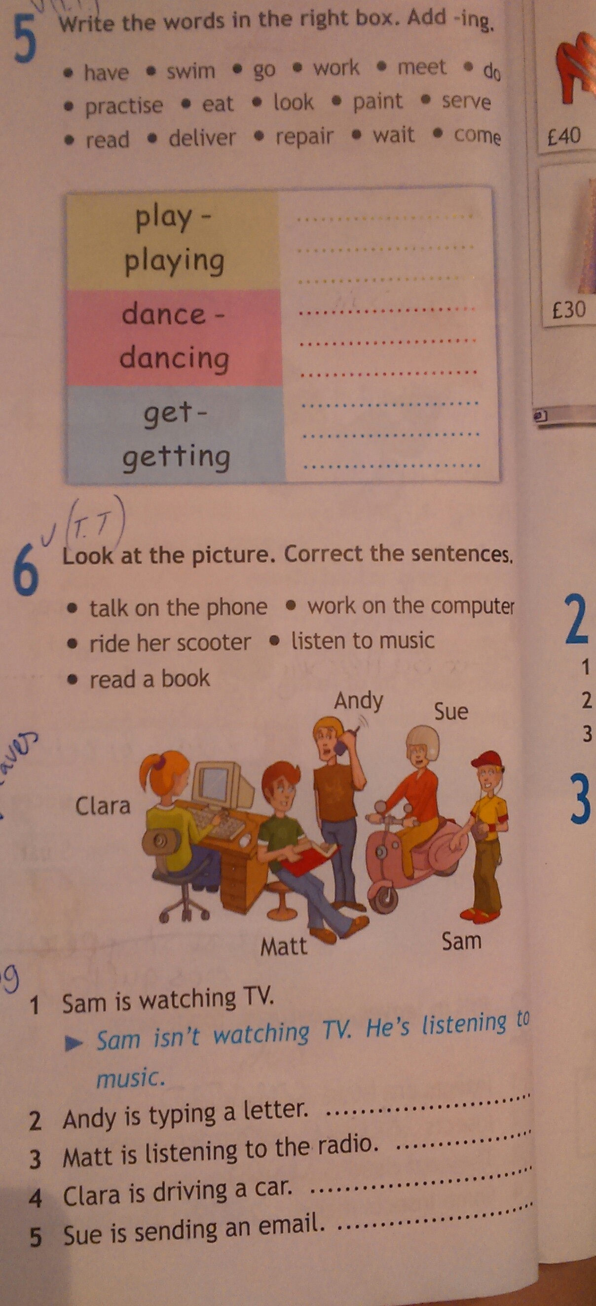 В 5 задании просто добавляешь к словам инговое окончание.