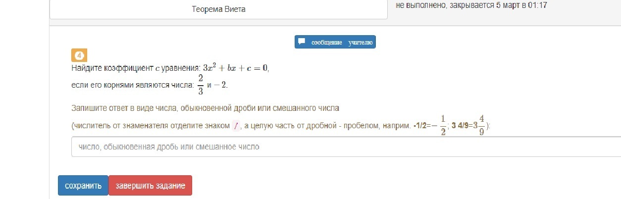 По теореме Виета х₁ · х₂ = с = -2/3 · 2 = -4/3 = -1 целая 1/3