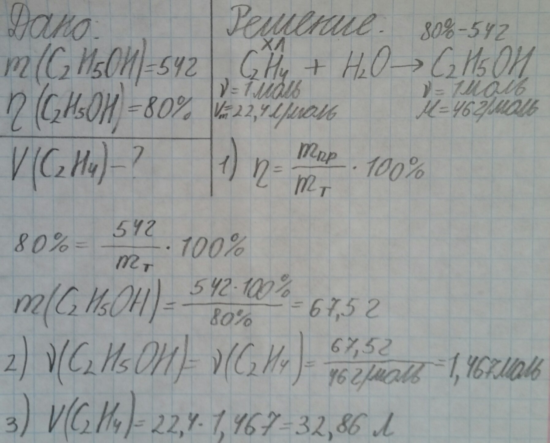 Определите объем этилена, необходимого для получения реакцией гидратации 54 г этилового спирта, если выход продукта от теоретически возможного составляет 80% (по массе)