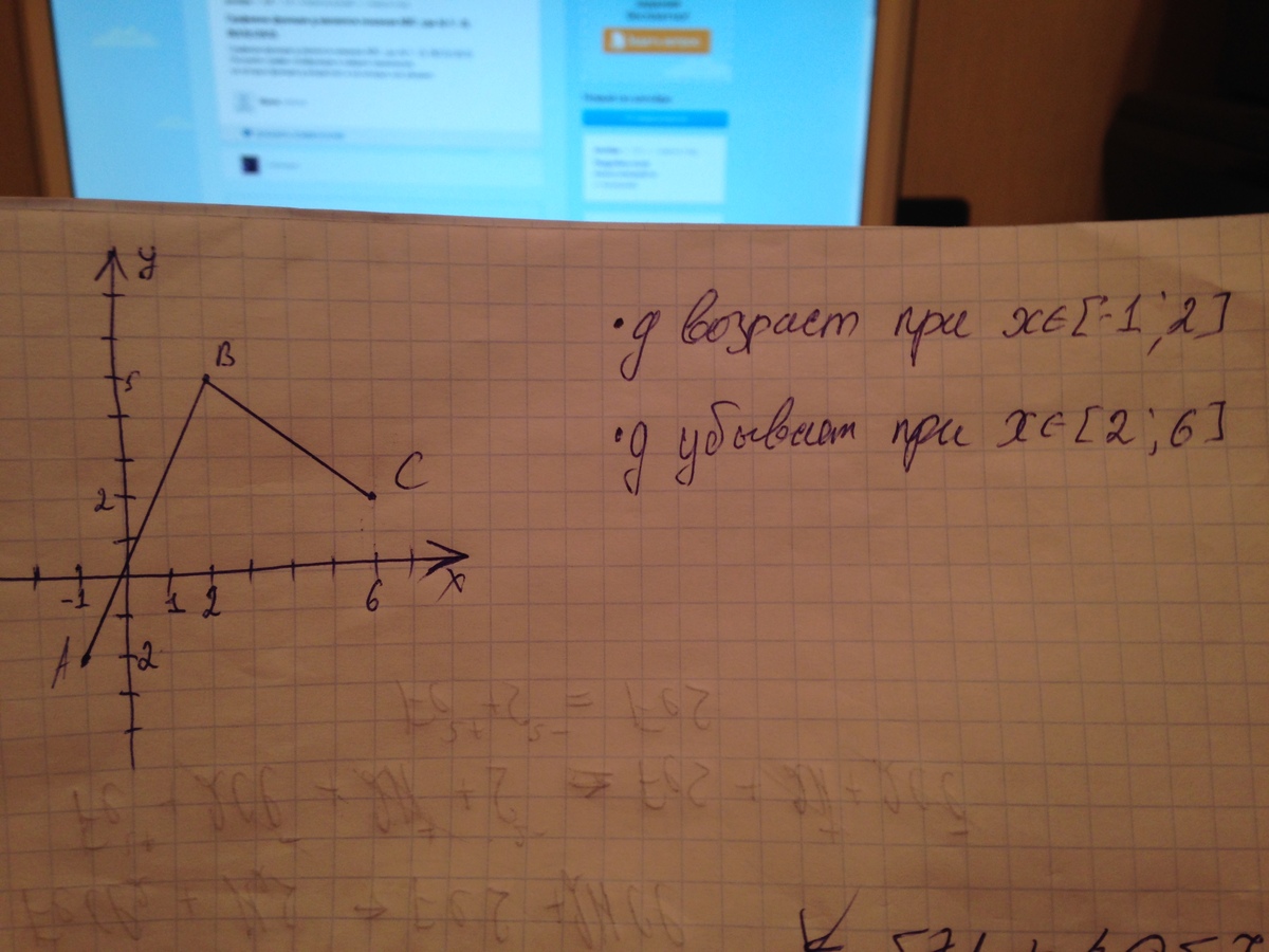 Графиком функции g является ломаная ABC ,где А(-1; -2), B(2;5),С(6;2). Постройте график этойфункции и найдите промежутки, на которых функция g возрастоет и на которых она убывает.