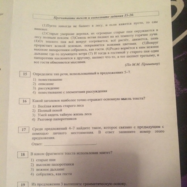 Это повествование, заголовок, скорее всего, - "Умей видеть тайную жизнь леса", номер - точно не скажу, или 5, или 7. Нежное дыхание - эпитет. Грамматическая основа - Падают лучи (3).