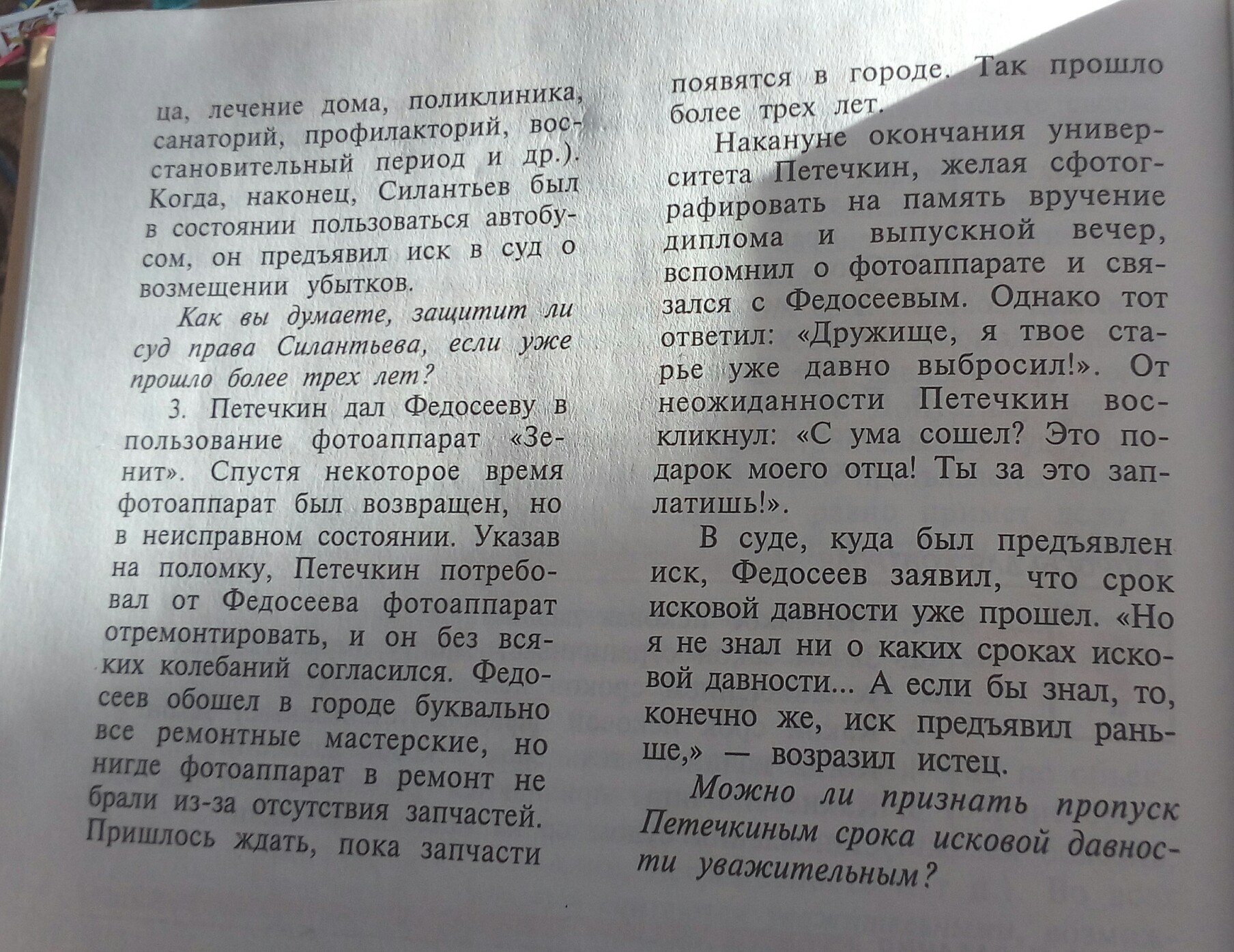 Уважительным пропуск исковой давности назвать нельзя, Петечкину следовало не забывать о столь значимой для него вещи или потребовать сразу новый фотоаппарат. Так же Пеетечкин мог потребовать у Федосеева через суд компенсацию ремонта и морального ущерба.