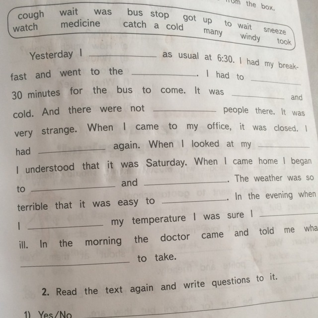 got up, bus stop,wait,windy, many , to wait, watch, cough, sneeze, catch a cold, took, was, medicine.