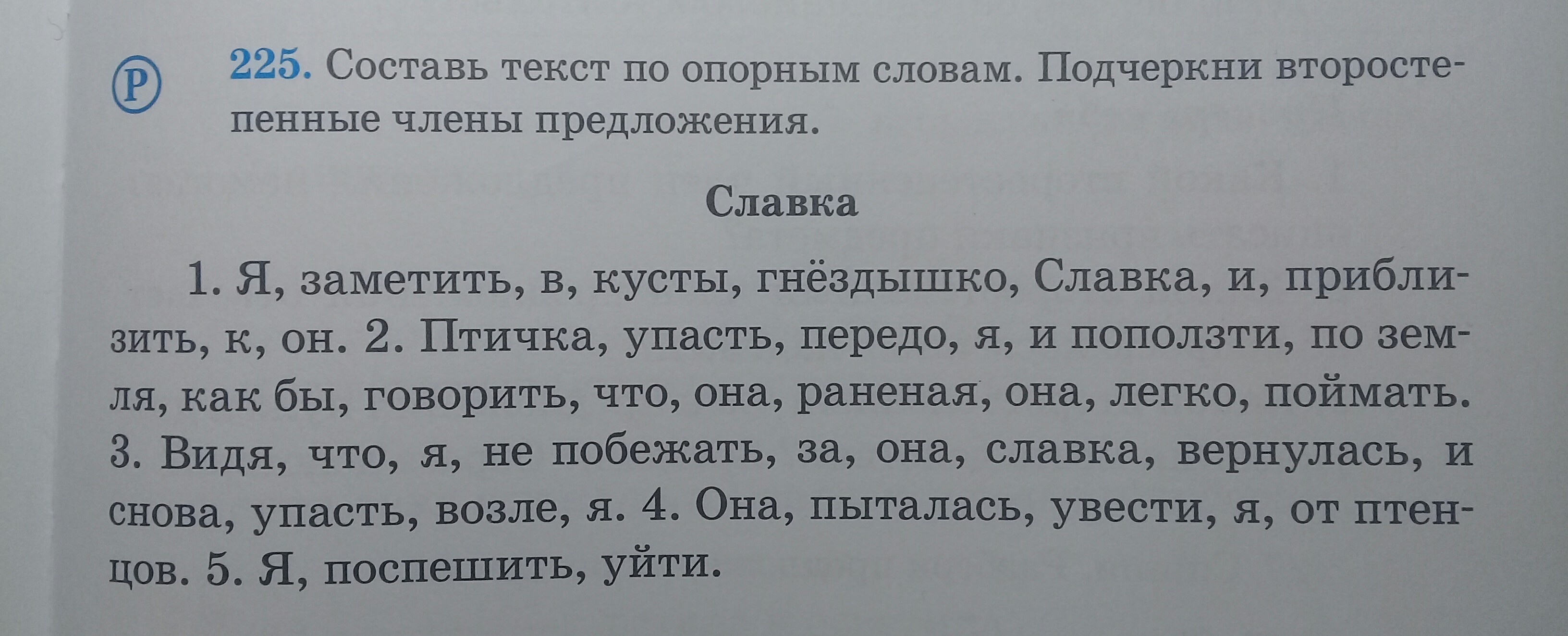 Я заметил в кустах (_._._) гнездышко (_ _ _) славки (_ _ _) и приблизился к нему (_ _ _). Птичка упала передо мною (_ _ _) и поползла по земле (_ _ _), как бы говоря (_._._), что она раненая, её (_ _ _) легко (_._._) поймать. Видя (_._._), что я не побежал за ней (_ _ _), славка вернулась и снова (_._._) упала возле меня (_._._). Она пыталась увести меня (_ _ _) от птенцов (_ _ _). Я поспешил уйти.